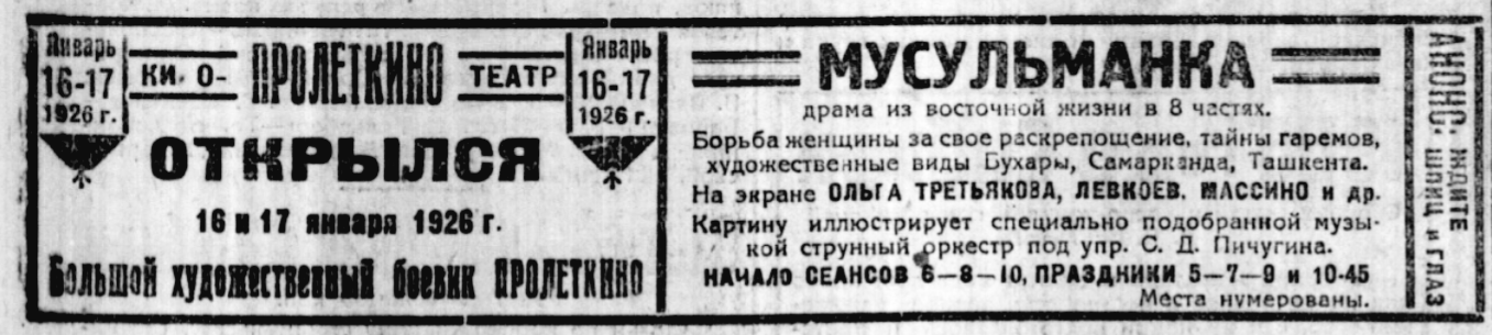 Итак, в день открытия «Пролеткино» пришедшим был представлен «большой художественный боевик „Мусульманка“ в 8 частях», снятый в Туркестане Дмитрием Бассалыго, кинорежиссером и председателем правления «Пролеткино» в 1923—1926 гг.