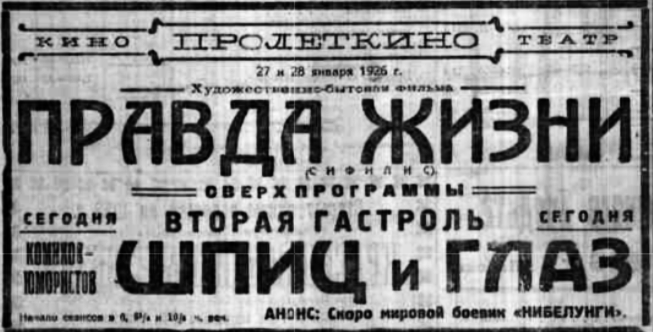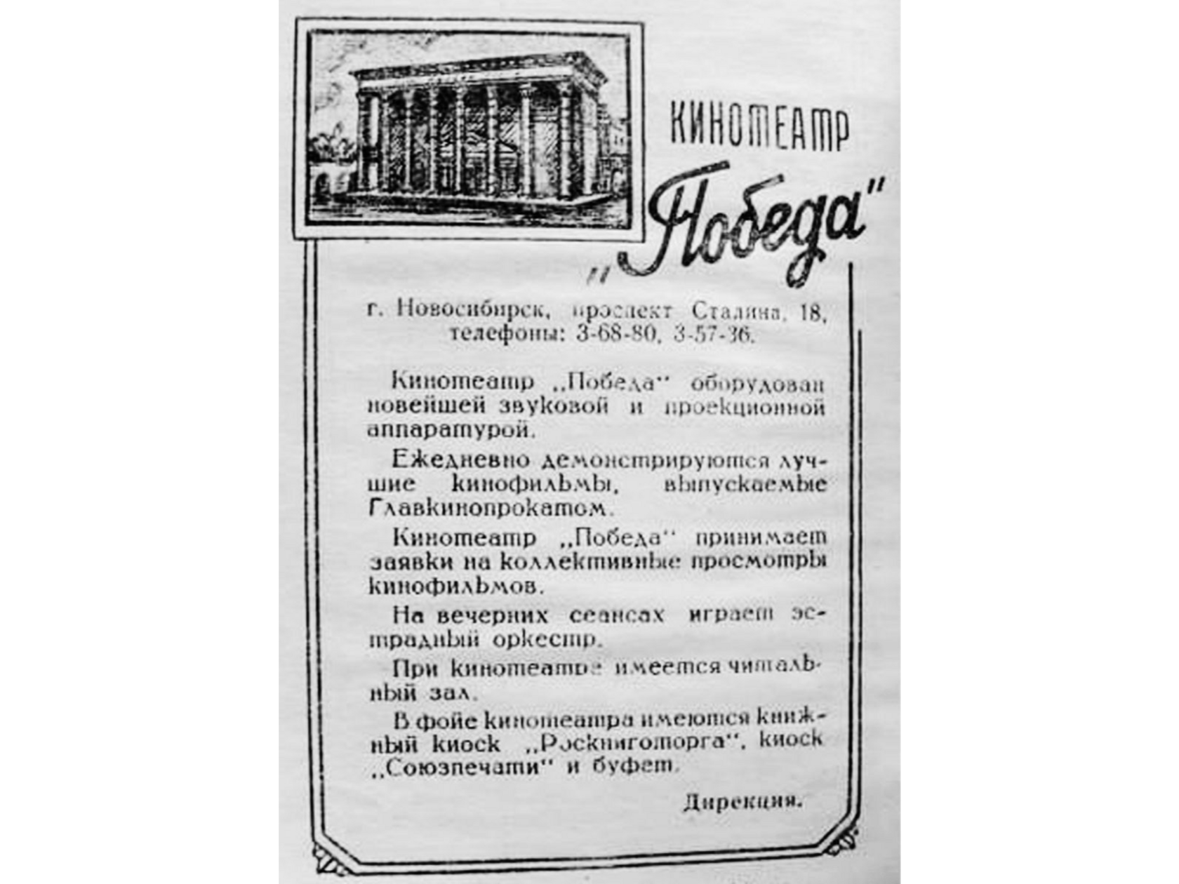 Так, в январе 1926 г. в центре Новониколаевска (с февраля 1926 г. — Новосибирск) появился самый большой кинотеатр (800 зрительских мест), получивший гордое имя «Пролеткино».