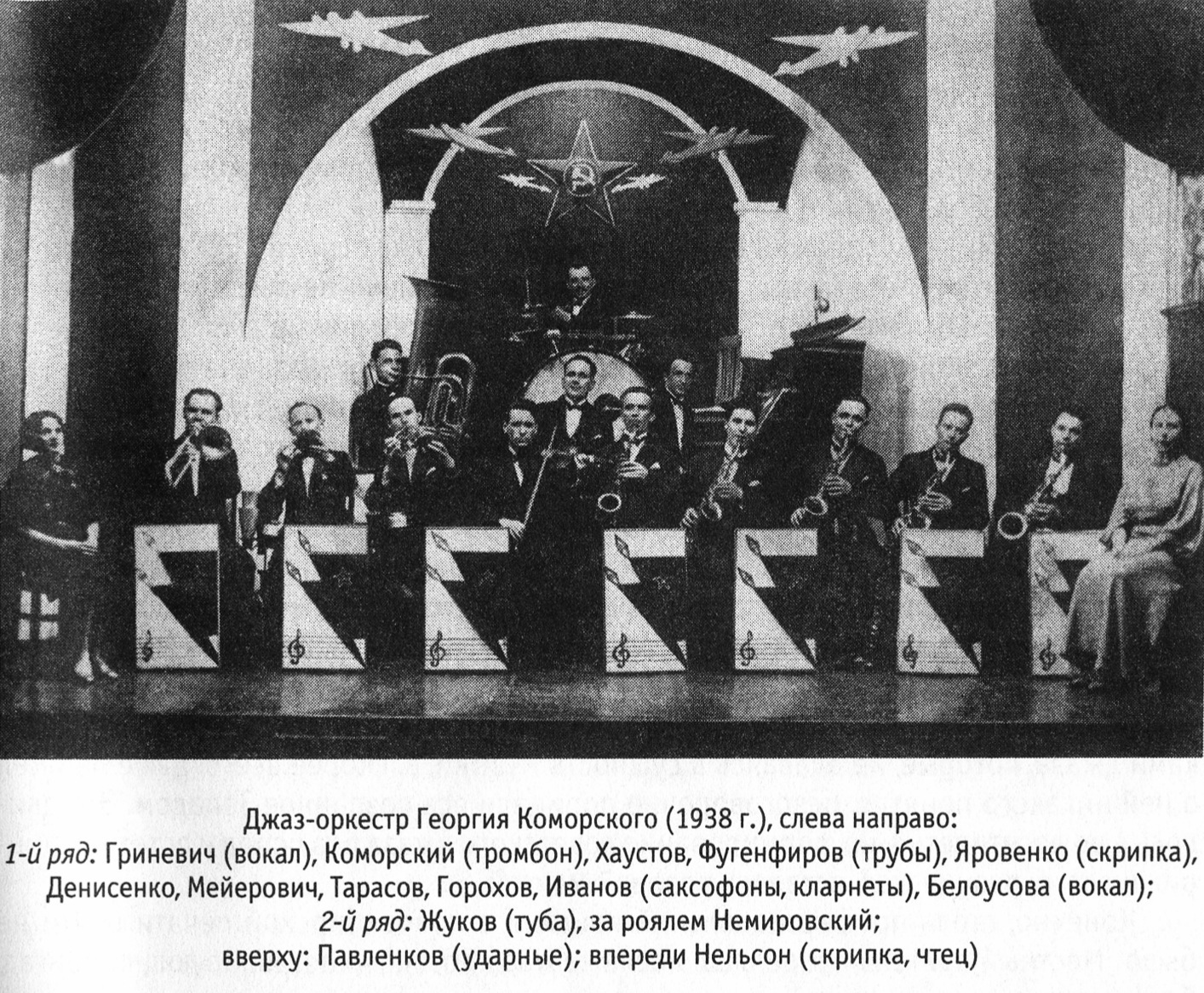 - Молодые люди тогда не ведали, что их счастье, музыка и джаз так кратковременны и трагичны. Коморский Георгий Михайлович (1904 —1938) — жертва политических репрессий. Профессия — руководитель джаз-оркестра «Роскино». Проживал в Новосибирске. Арестован 28 апреля 1938 года. Обвинен в «участии в контрреволюционной шпионской организации» (ст. 58−6−8−11 УК РСФСР). Осужден 4 октября 1938 года Тройкой УНКВД НСО. Приговор — ВМН (расстрел, приговор приведен в исполнение 10 октября 1938 года). Реабилитирован 28 ноября 1958 года. (Книга памяти жертв политических репрессий в Новосибирской области. т. 1)