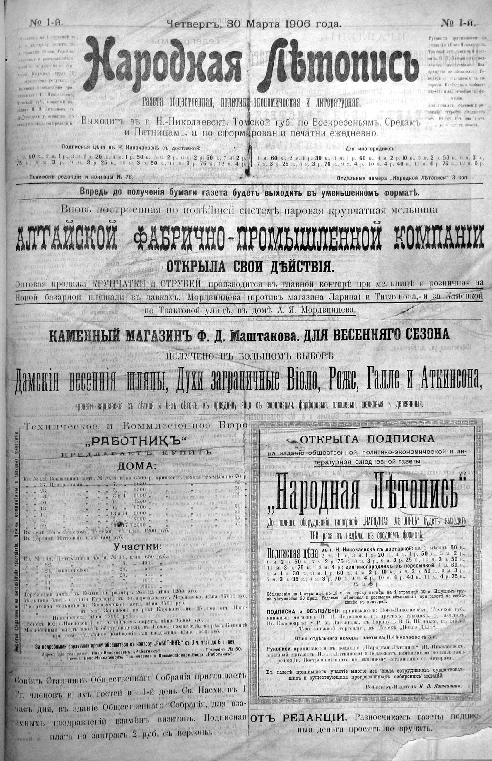 Первая общественная, политико-экономическая и литературная городская газета Новониколаевска, издаваемая Николаем Павловичем Литвиновым (о нем мы расскажем в следующей статье), называлась «Народная летопись».