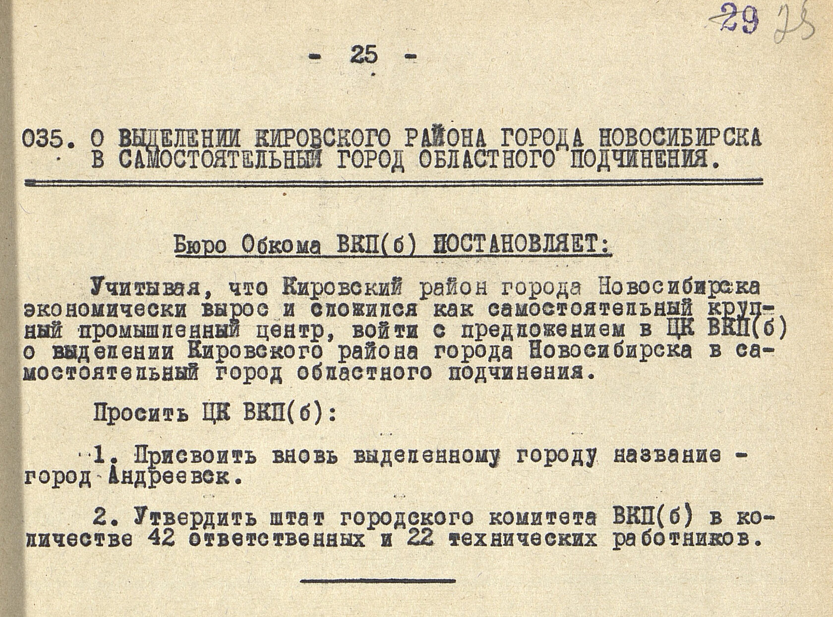Левый берег Новосибирска вырос в мощный индустриальный узел, и уже в 1942 г. Новосибирский обком ВКП(б) предложил правительству страны выделить Кировский район в самостоятельный город областного подчинения с названием «Андреевск», но инициатива не получила одобрения.