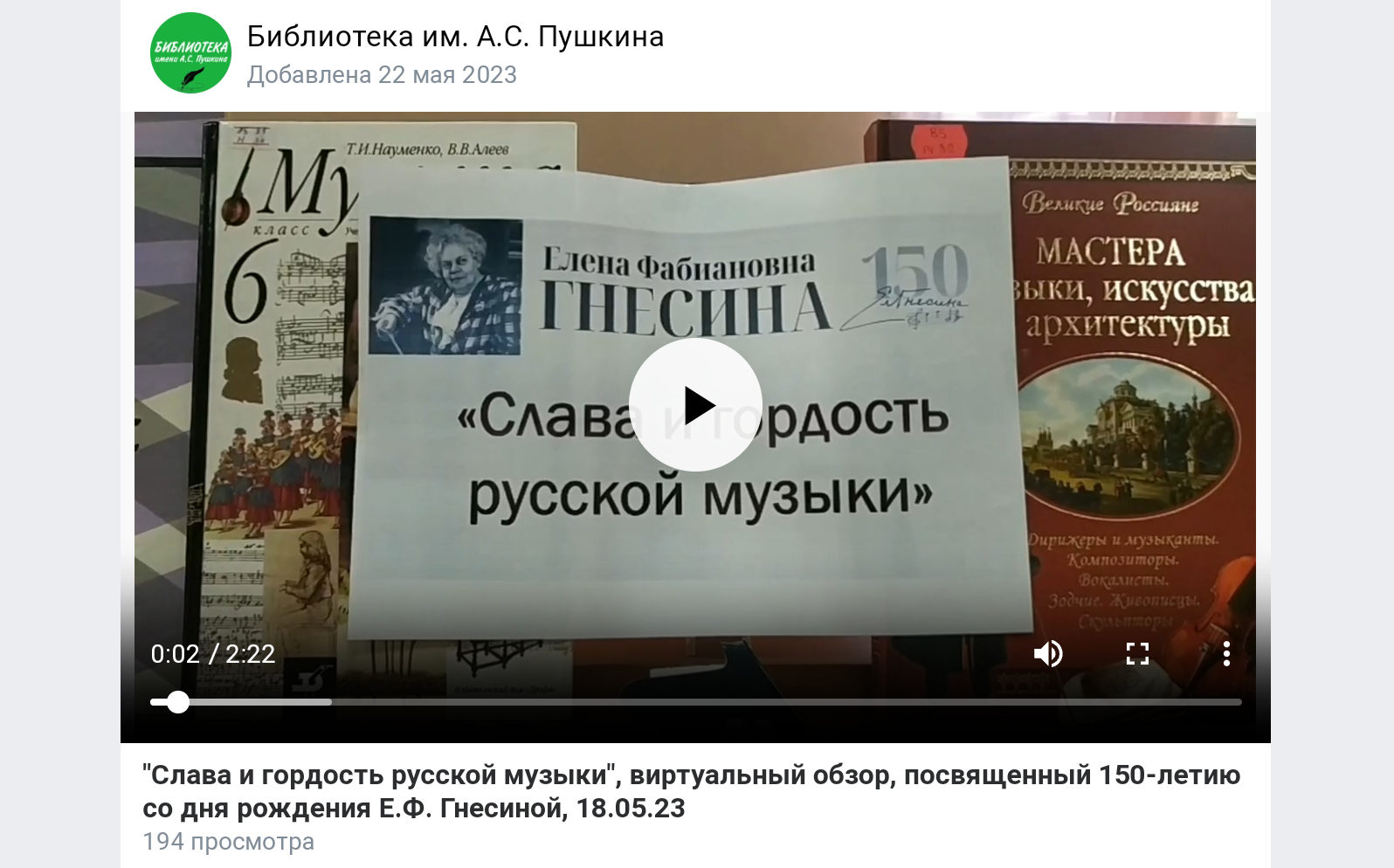 18 мая сотрудники библиотеки им. А. С. Пушкина подготовили и провели для подписчиков социальной сети ВКонтакте виртуальный обзор литературы к дню рождения Е. Ф. Гнесиной и юбилею, который будет отмечаться в следующем году.
