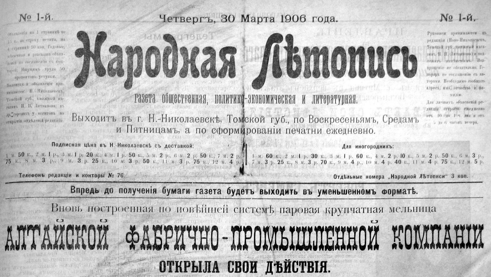 «Народная летопись» — первая общественная, политико-экономическая и литературная городская газета Новониколаевска — вышла в свет 30 марта 1906 г. (12 апреля по новому стилю) во время Первой русской революции и выборов в Государственную Думу. Как и любая провинциальная газета, наша газета освещала заграничную, российскую, сибирскую и местную жизнь.