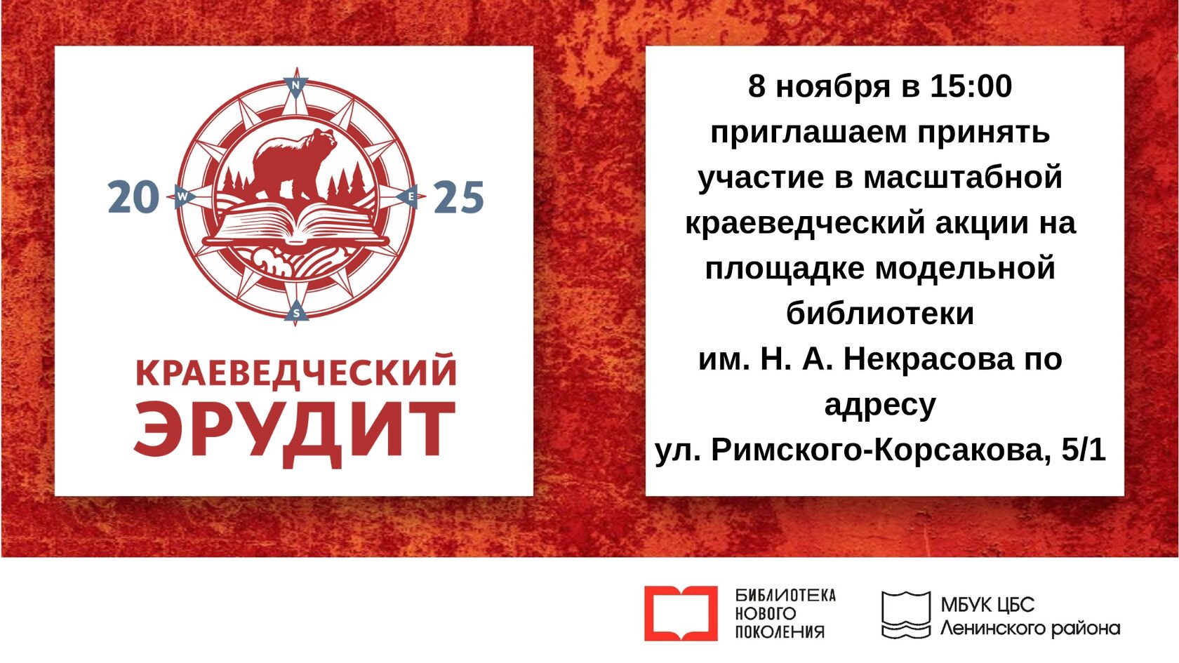 8 ноября 2025 года модельная библиотека им. Н. А. Некрасова станет одной из площадок историко-культурной просветительской акции «Краеведческий эрудит — 2025», организованной Новосибирской государственной областной научной библиотекой.
