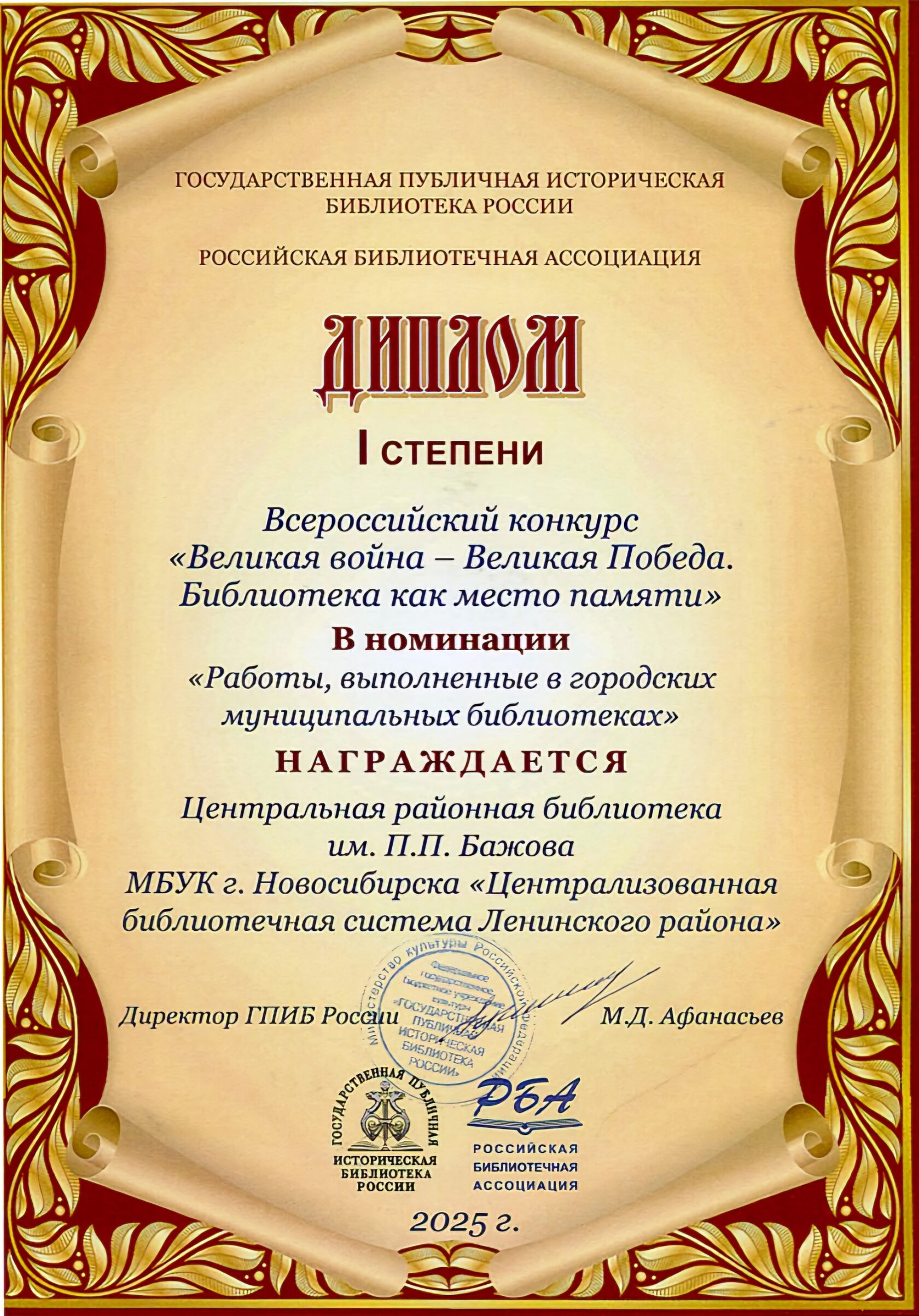 13 ноября 2025 года подведены итоги Всероссийского конкурса библиотечных проектов «Великая война — Великая Победа. Библиотека как место памяти». Организатор: Государственная публичная историческая библиотека России при информационной поддержке Российской библиотечной ассоциации.